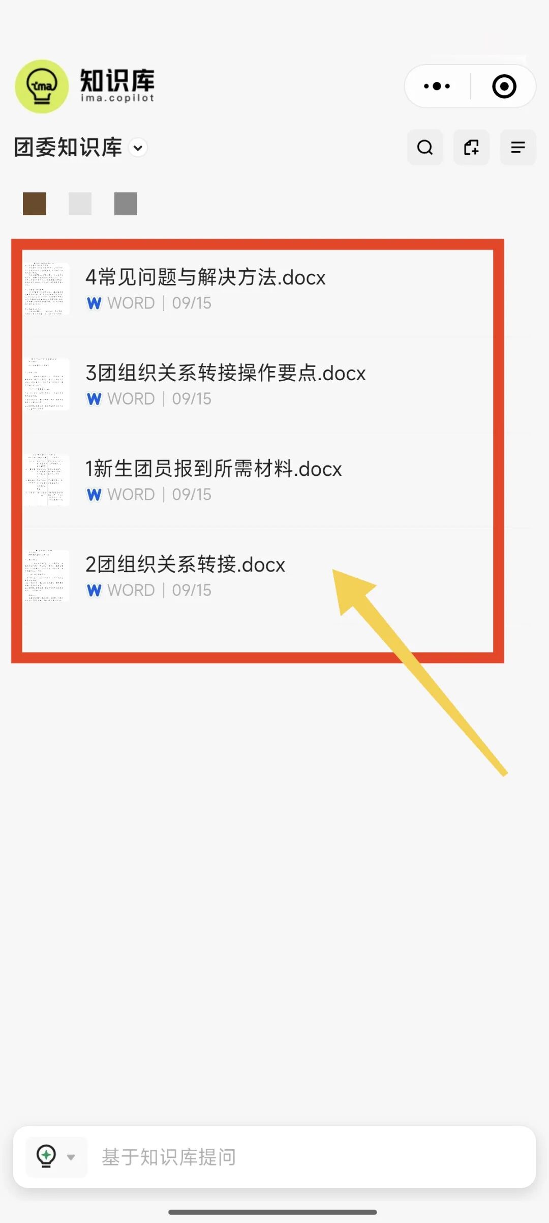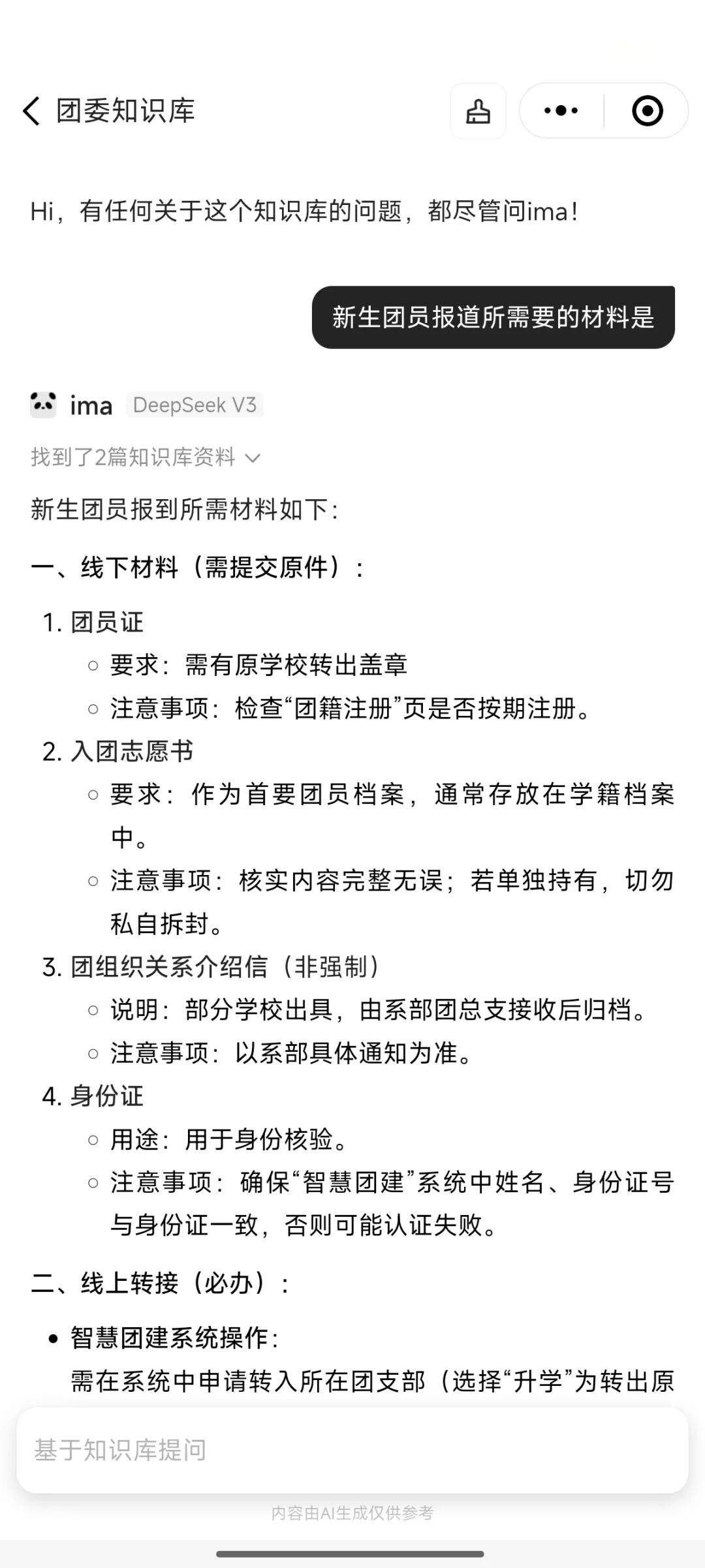 选择“共青团服务指南”,在这里,你可以点击文档查找各类知识,从团务流程到校园资讯,应有尽有;还能直接向知识库提问,会快速为你答疑解惑,就像拥有了一个随时随地的智能小管家!