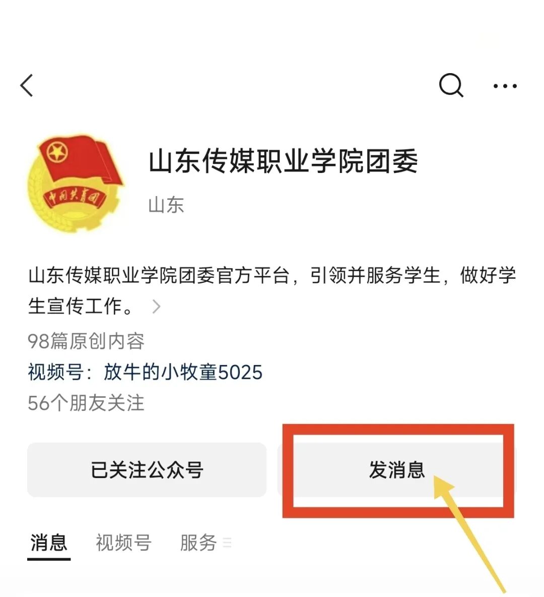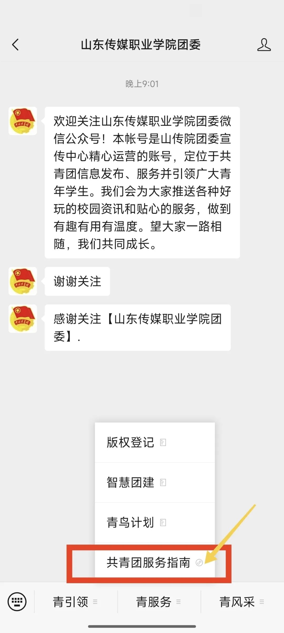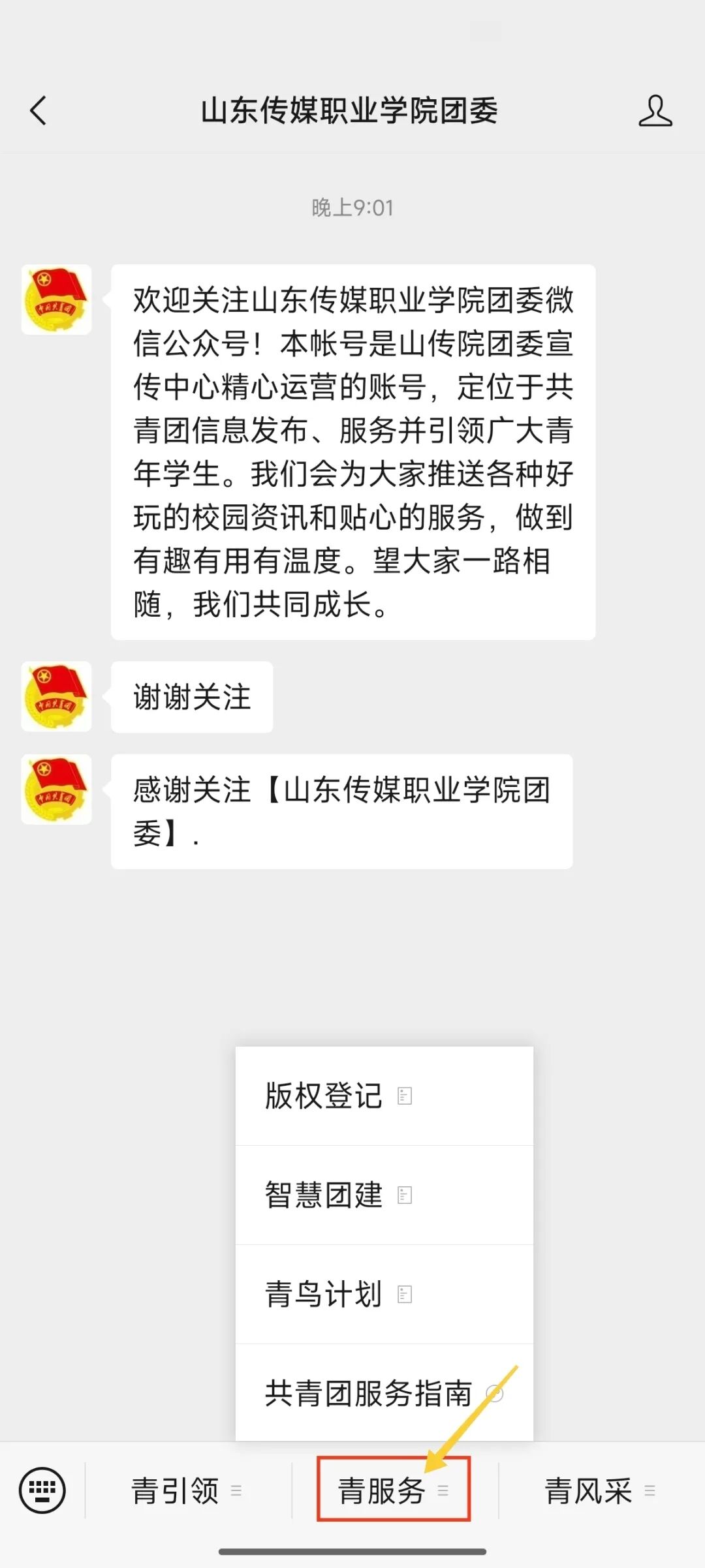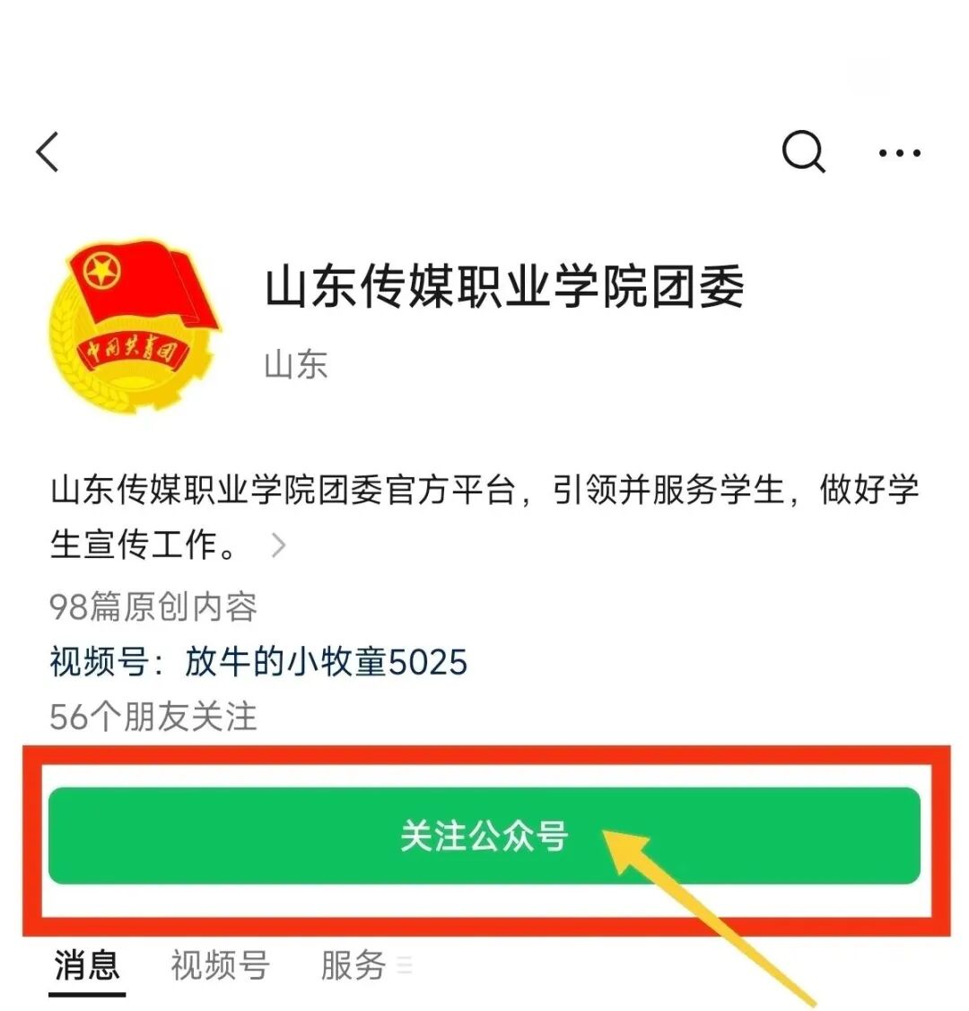先点击关注“山东传媒职业学院团委”微信公众号,这是解锁所有服务的第一步。